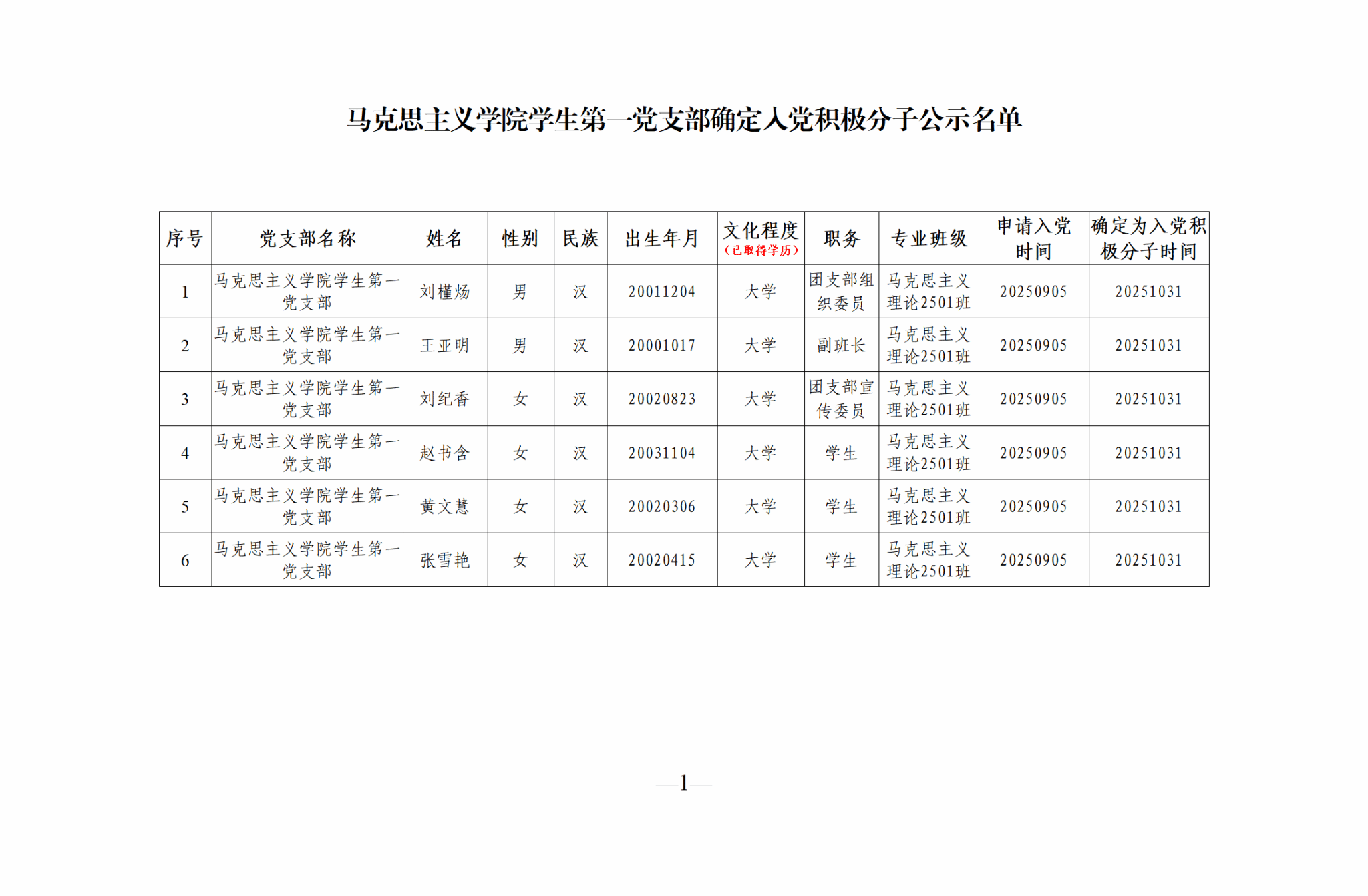 学生第一党支部确定入党积极分子公示名单