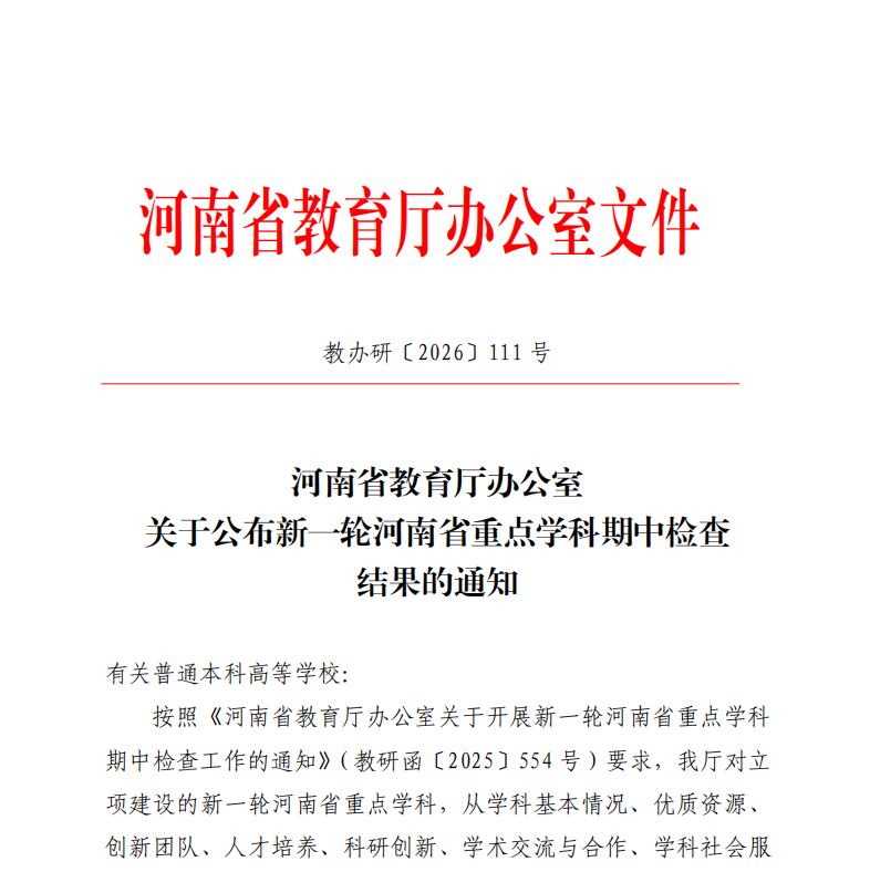 根据《河南省教育厅办公室关于公布新一轮河南省重点学科期中检查结果的通知》(教办研〔2026〕111号),教育厅从学科基本情况、优质资源、创新团队、人才培养、科研创新等方面对建设学科期中目标达成情况和标志性成果质量与水平进行了全面评价,优塔娱乐城