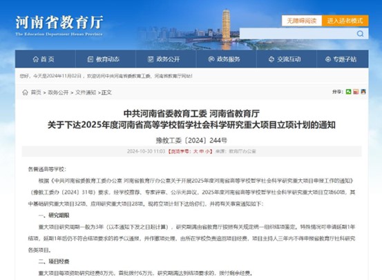 10月30日,河南省教育厅发布《关于下达2025年度河南省高等学校哲学社会科学研究重大项目立项计划的通知》(豫教工委〔2024〕244号),优塔娱乐城