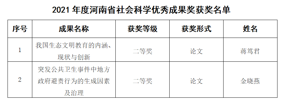 河南省社会科学优秀成果奖是我省目前最高层次的哲学社会科学奖项,用以奖励在哲学社会科学研究领域作出较大贡献、具有较高学术价值或应用价值的研究成果,是衡量高校哲学社会科学发展水平和科研实力的重要标志。2021年度河南省社会科学优秀成果共评出275项,其中,一等奖30项,二等奖110项,三等奖135项。(文/范玉鹏 审校/吴若旻 审核/李海涛)