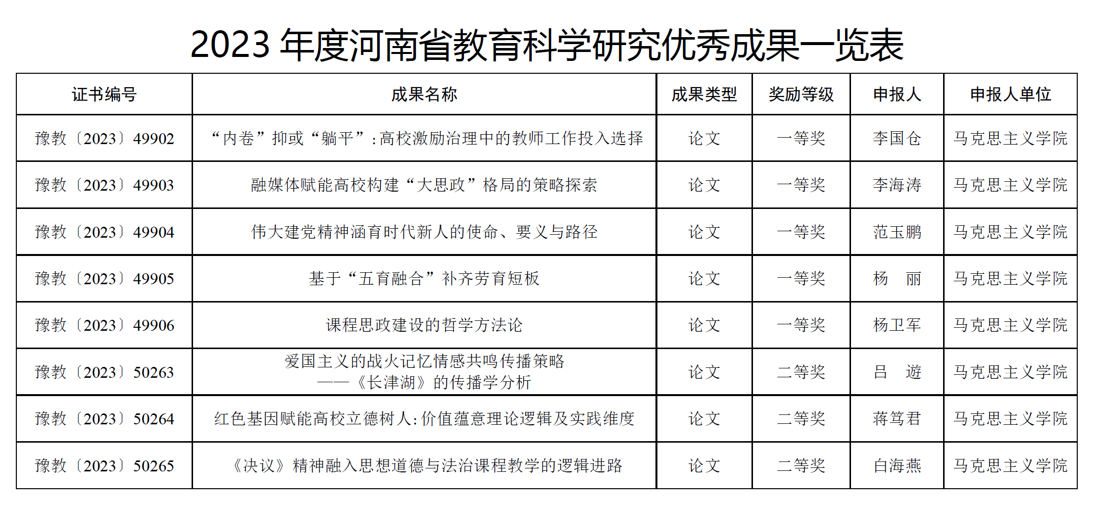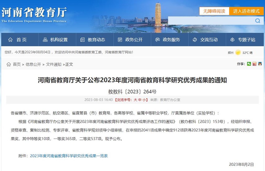 8月3日,河南省教育厅发布《关于公布2023年度河南省教育科学研究优秀成果的通知》(教教科〔2023〕264号)。经组织申报、资格审查、复制比检测、专家评审、省教育科学规划领导小组审核,在申报的2041项成果中确定912项获得2023年度河南省教育科学研究优秀成果奖。优塔娱乐城