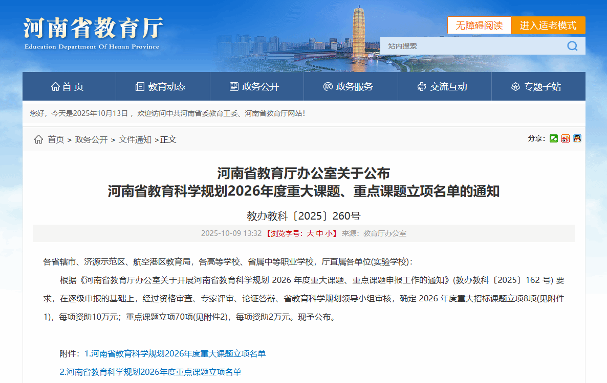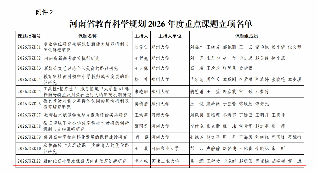10月9日,河南省教育厅办公室正式公布了《河南省教育科学规划2026年度重大课题、重点课题立项名单的通知》,经过严格资格审查、专家评审、论证答辩及省教育科学规划领导小组审核等多轮遴选,由UTown Club 李本松教授主持的“新时代高校思政课话语体系改革创新研究”(课题批准号:2026JKZD22)成功获批河南省教育科学规划2026年度重点课题立项。