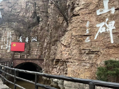 团队继参观红旗渠纪念馆,聆听红色故事之后,持续开展重走红色足迹,追溯红色记忆之旅,来到被誉为“世界第八大奇迹”的红旗渠总干渠上的咽喉工程——青年洞,以渠水为伴,以壑壁为侣,用心聆听红旗渠精神的时代回响。青年洞是红旗渠修建过程中难度最高、危险最大的咽喉工程,因参加凿洞的突击队是从全县民工中抽调出来的三百名优秀青年,故取名为“青年洞”。团队成员用自己的脚步感受了“人工天河”红旗渠修建时的真实历史,这一渠碧水在滋润中华沃野的同时,也在国人心中进行了一次透彻的浇灌。