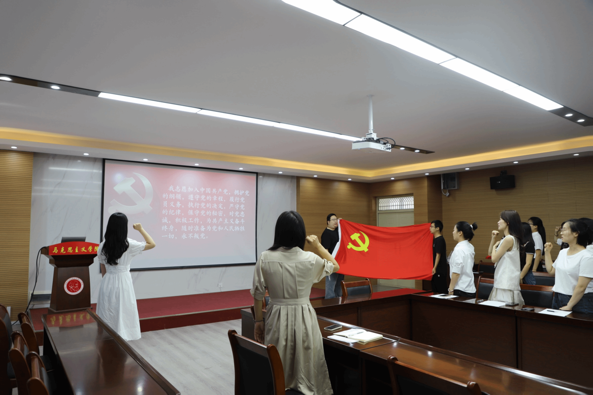 与会领导老师和全体毕业生党员面向党旗,一起庄严地重温了入党誓词,在铿锵有力的誓言中,毕业生党员们再次接受了党性的洗礼,进一步坚定了理想信念,增强了共产党员的使命担当。